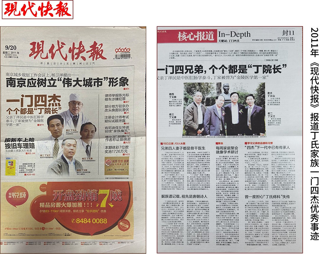 在学术界,南京市中医院肛肠科及全国肛肠医疗中心创始人丁泽民教授是多届中华中医药学会肛肠分会会长及名誉会长,曾出席全国群英会,担任亚洲及太平洋区域肛肠会议执行主席。丁泽民长子丁义山教授,曾任中华中医药学会肛肠分会副会长,中国人民解放军全军肛肠学会会长,第二军医大学南京医学院外科教研室副主任,现为南京及周边地区第一家民营肛肠医院院长;次子丁义江,现任南京中医药大学教授,博士生导师,全国肛肠医疗中心主任,现任中华中医药学会肛肠分会会长;三子丁义涛,南京大学医学院教授,南京鼓楼医院院长,我国著名肝胆外科、肝移植专家、中共15大、16大代表;四子丁义林,南京市口腔医院副院长。丁氏四兄弟的夫人均为医院临床医师。第十代中有三人从医,丁曙晴、丁彤从事肛肠专业。丁泽民一支四世同堂,三代人中有十四位医师,是历史的产物,是丁氏家谱中的辉煌盛世,也是祖国医学史中的奇迹。